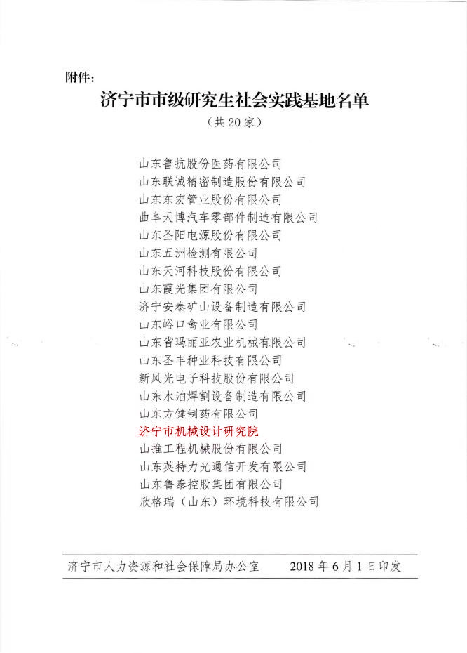 近日,通過濟寧市人力資源和社會保障局獲悉,我院順利成為濟寧市第一批研究生社會實踐基地。此次申報研究生社會實踐基地,需要企業建有科研實驗室、工程實驗室、工程技術研究中心、博士后工作站等人才創新實踐載體,需要與高校聯合開展技術研發、課題攻關、成果轉化等產學研活動,并取得突出實際成果。