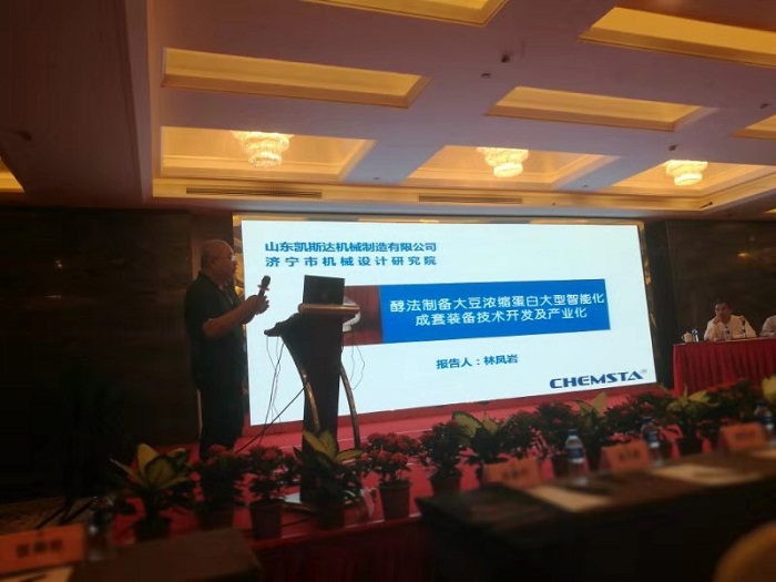 山東凱斯達公司林鳳巖總工程師在大會上作了題為《醇法制備大豆濃縮蛋白大型智能化成套裝備技術及產業化》的報告,報告簡要介紹了山東凱斯達公司近十幾年來在醇法制取大豆濃縮蛋白裝備制造領域從無到有、從小到大所走過的自主創新歷程;詳細闡述了醇法制備大豆濃縮蛋白成套裝備在向大型化、智能化方向發展過程中,在工藝、關鍵加工裝備、智能化運行等方面所取得的創新成果、所獲得的發明專利、解決的技術難題;與國內外同類裝備在工藝、規模、產品指標及綜合經濟技術指標等方面進行了對比、分析,充分展示了山東凱斯達在該領域技術及裝備的優越性。