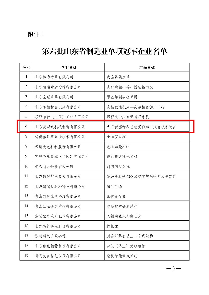 近日,山東省工業和信息化廳、山東省工業經濟聯合會聯合發布了第六批制造業單項冠軍企業名單,山東凱斯達機械制造有限公司“大豆低溫粕和植物蛋白加工成套技術裝備”成功入圍。